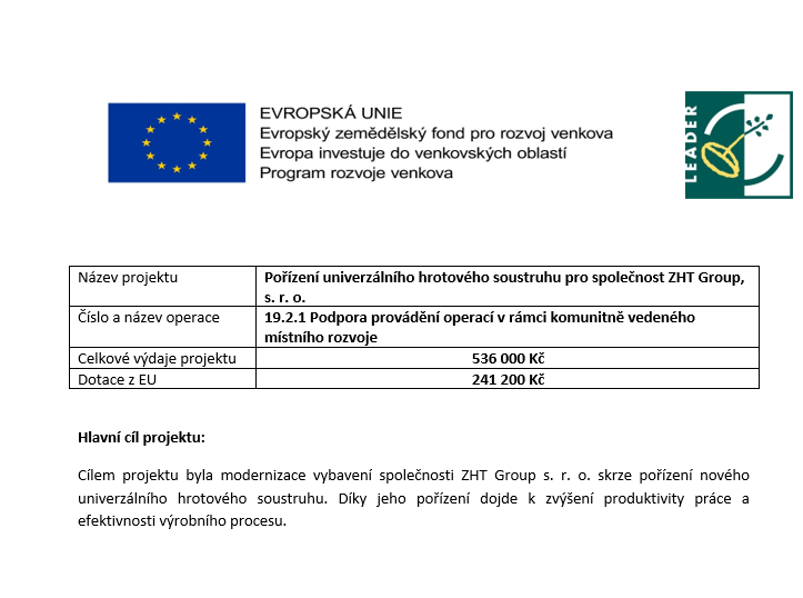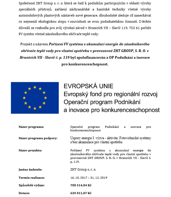Společnost ZHT Group s.r.o., která se řadí k podnikům participujícím v oblasti výroby speciálních přístrojů, zařízení záchranářské a hasičské techniky, včetně výroby automobilových plastových nástaveb nové generace, dlouhodobě sleduje cíl zanechávat co nejmenší ekologickou stopu v souvislosti se svou podnikatelskou činností. Z těchto důvodů se rozhodla pro svůj výrobní závod v Hranicích VII – Slavíč 16, 753 61 pořídit fotovoltaickou elektrárnu o velikosti 20 kW bez akumulace.