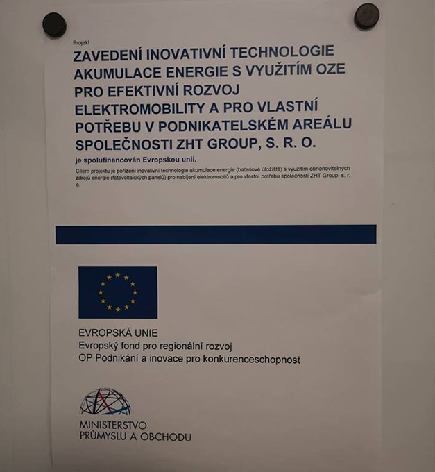 Projekt s názvem Zavedení inovativní technologie akumulace energie s využitím OZE pro efektivní rozvoj elektromobility a pro vlastní spotřebu v podnikatelském areálu ZHT Group s. r. o. byl spolufinancován z OP Podnikání a inovace pro konkurenceschopnost.