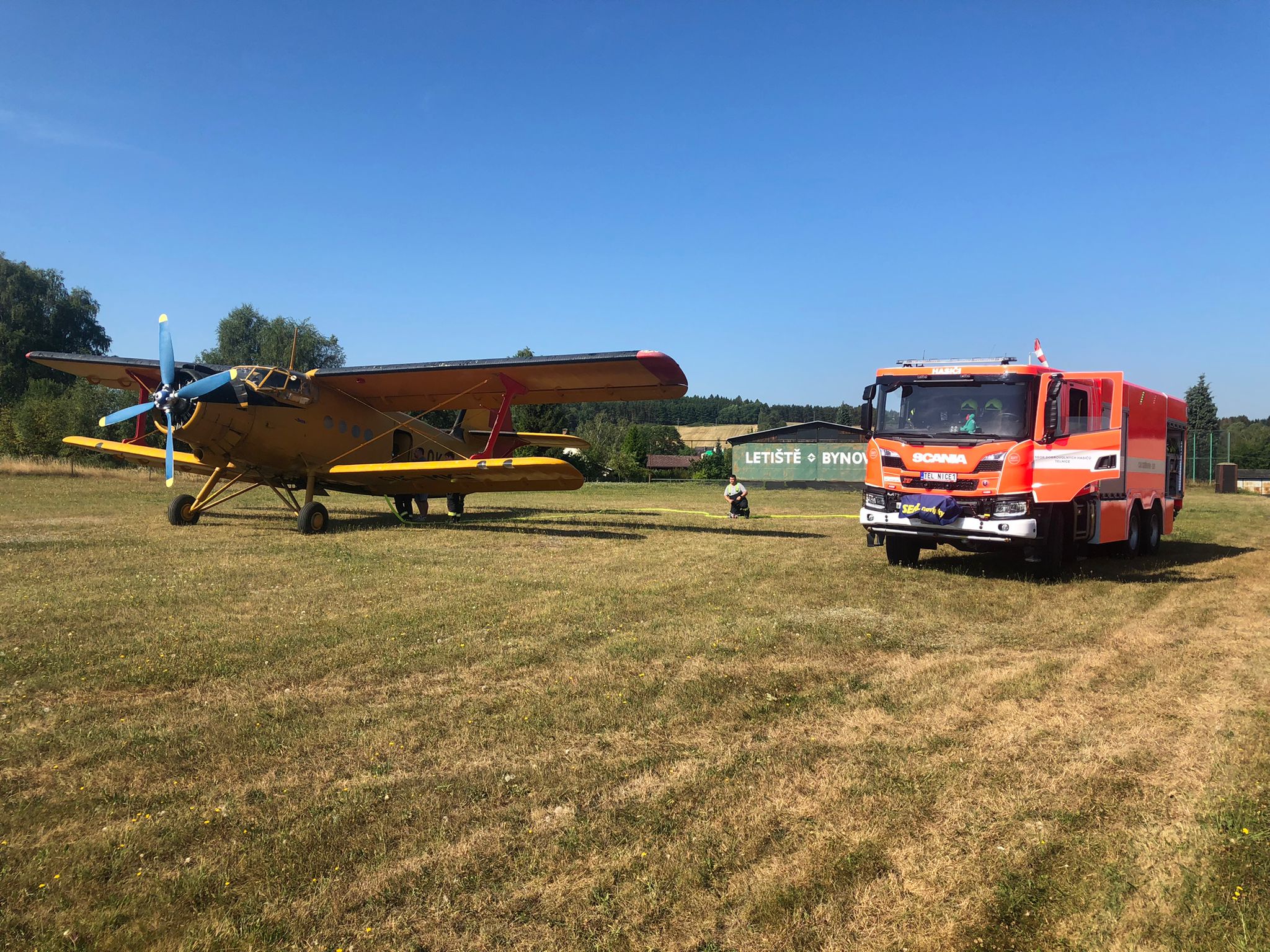 I za pomoci přenosných stříkaček Tohatsu bojují hasiči s požárem lesa v oblasti Hřenska. Na fotkách níže můžete vidět i CAS Scania od ZHT, jak plní hasičské letadlo.