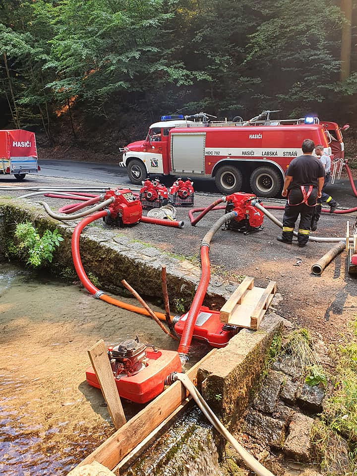 Stříkačky Tohatsu pomahájí zdolávat lesní požár u Hřenska