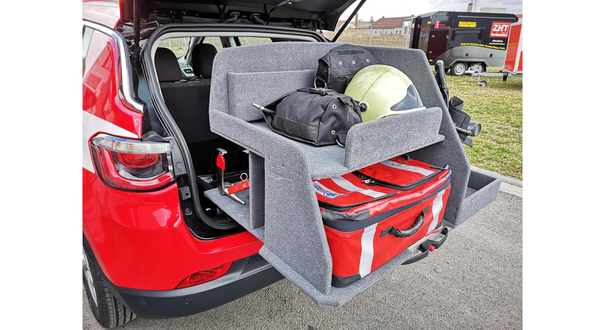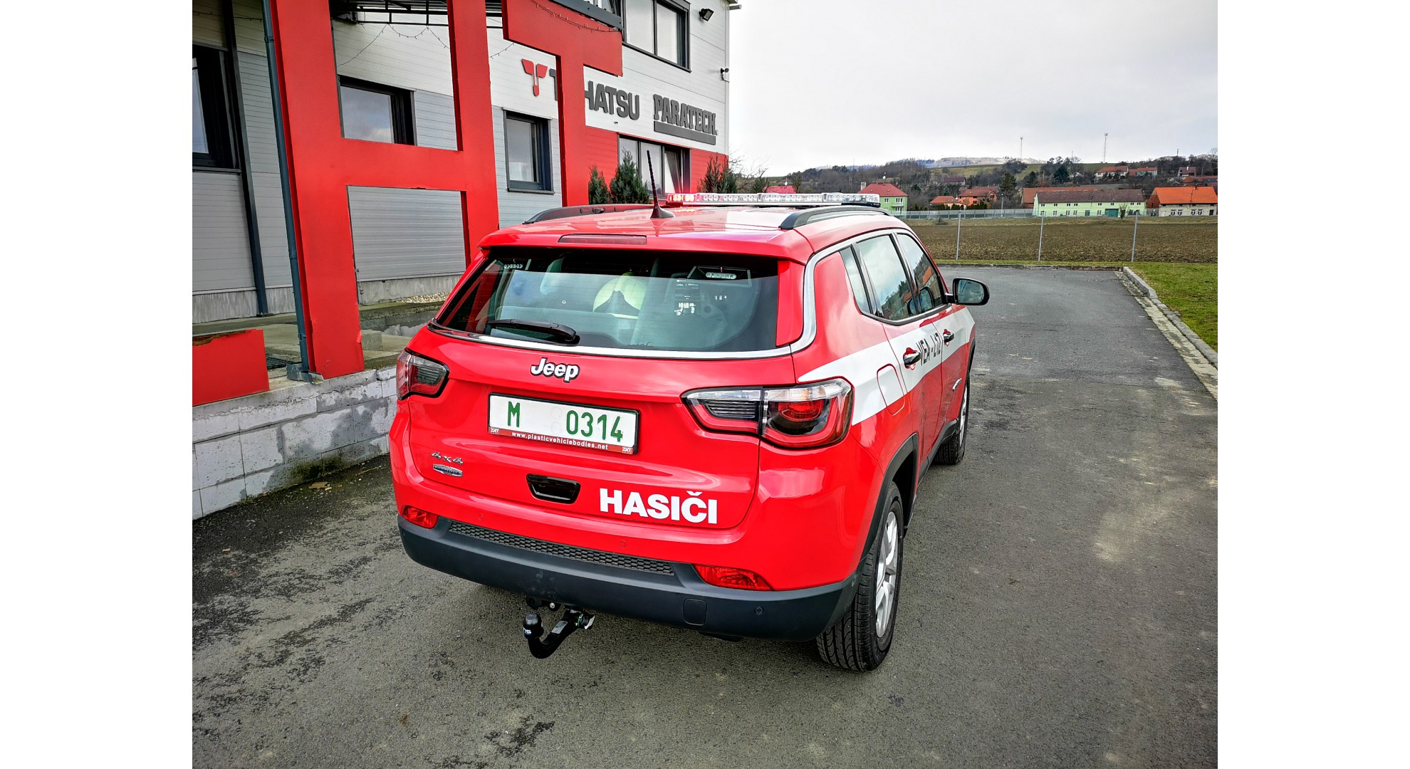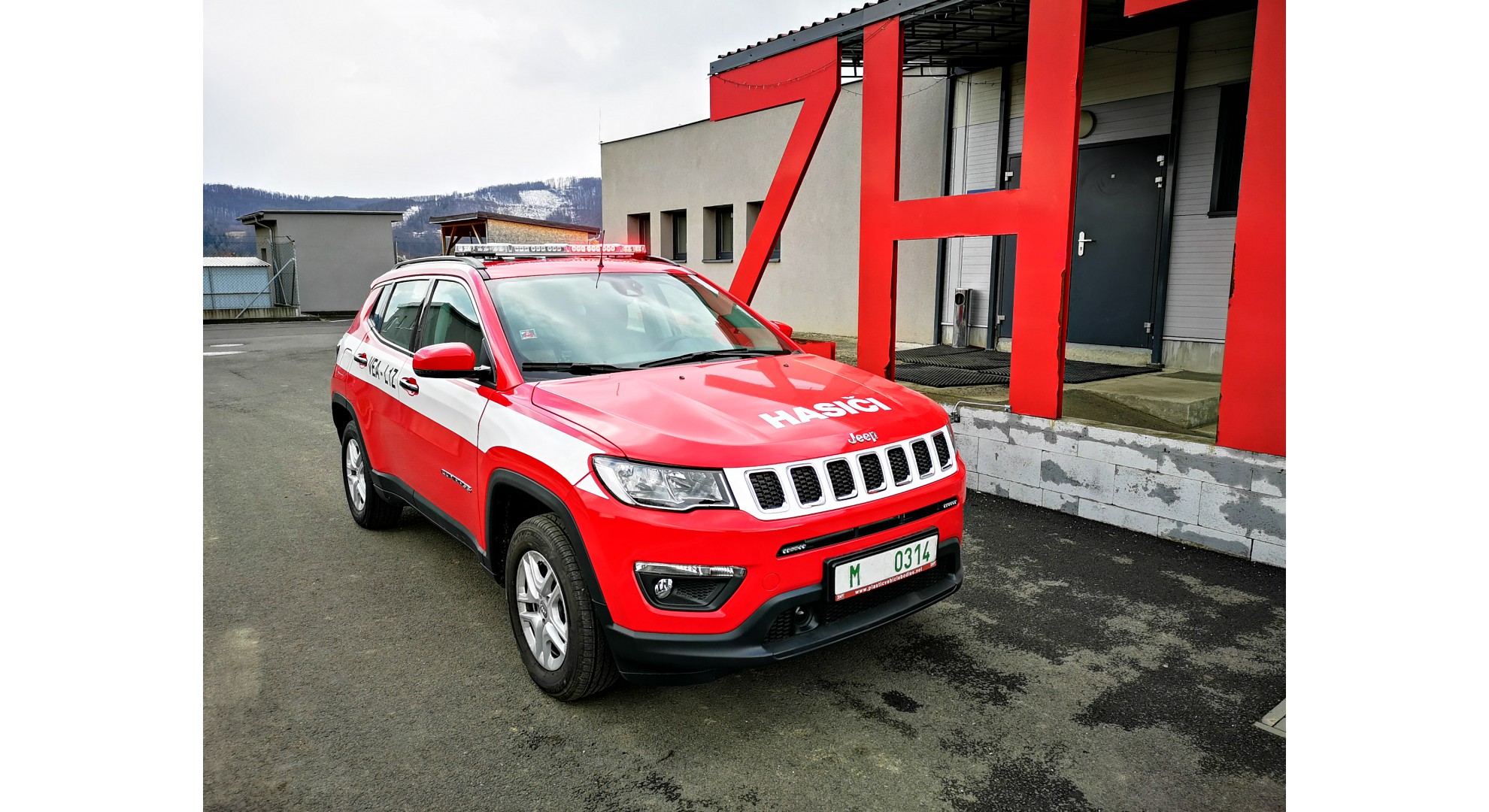 Velitelský automobil pro JSDH Adamov na podvozku Jeep Compass. Vozidlo je provedeno v laku RAL 3000 a také je vybaveno výstražným zařízením modro-červené barvy.